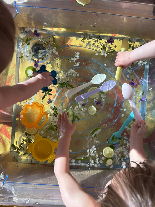 The infant educators have observed that our infants enjoy sensory activities especially those that involve water play. This month we have been engaging in lots of water play that creates different experiences using the tuff tray and sensory bins. This time, we thought we could incorporate using our five senses. Instead of just putting water toys in the tray, we added flowers and lime slices. The children showed excitement on their faces when scooping the flowers up. Some of the children were seen using spoons or their hands to feel and transfer the flowers to bowls. Some of the bowls had holes which made a lovely sound of trickling water. The smell of the flowers flooded the room, the children then took some of the limes and tried it, the children were unsure at first but kept on trying again. They were seen giggling, unsure of what this sour taste was. Incorporating our five senses gives the children the opportunity to explore the world around them and amplify their creative minds. This activity was such a hit for our infants and is definitely something we will can build on.